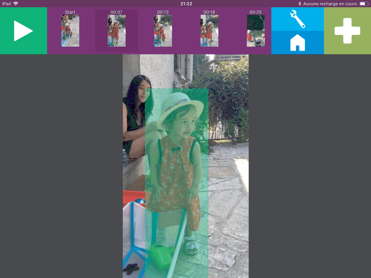 Dans le bandeau mauve situé en haut, deux mignonnette s’affichent, sous titrées Start et End pour matérialiser le départ et la fin de la vidéo. Lancer la vidéo depuis le bouton Lecture, et la mettre en Pause là ou l’on souhaite placer un marqueur, en suivant la même technique que pour les images. Il est possible de placer plusieurs marqueurs sur un arrêt sur image. Les différents arrêts sur images où seront placés des marqueurs s’afficheront sous forme de mignonnettes numérotées dans le bandeau supérieur, entre les mignonnettes Start et End.