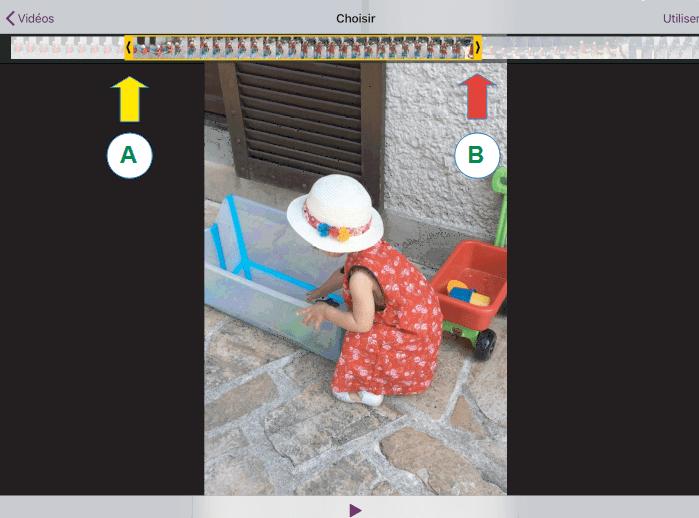 La technique est globalement identique pour le placement de marqueurs sur une séquence vidéo. Après avoir pris une vidéo depuis la tablette ou l’avoir choisi depuis la galerie ou le Cloud, la vidéo s’affiche en plein écran avec l’intéressante possibilité de n’en sélectionner qu’une partie, à partir des curseurs situés en haut d’écran. Cliquer sur le bouton « utiliser », la vidéo se prépare et s’affiche dans la fenêtre de GoVisual.