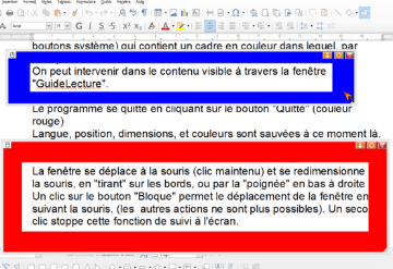 Tout récent, « Guide de lecture » a été écrit à notre demande par Idée, afin de proposer une alternative à la disparition du logiciel Vu-Bar, très apprécié pour sa simplicité. le programme affiche une fenêtre qui contient un cadre en couleur dans lequel on voit par transparence le contenu survolé. La fenêtre se déplace à la souris (clic maintenu) et se redimensionne à la souris, en « tirant » sur les bords, ou par la « poignée » située en bas à droite.