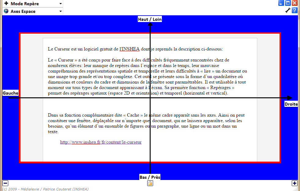 Conçu par l’INSHEA en collaboration avec la société Médialexie, « Le Curseur » se présente sous la forme d’un quadrilatère paramétrable (dimensions, couleur et épaisseur), utilisable sur toute application. La fonction dite « cache » masque l’écran et laisse visible l’intérieur du cadre pour faciliter le repérage d’un élément au sein d’un ensemble de figures, un paragraphe, une ligne dans un texte,etc.
