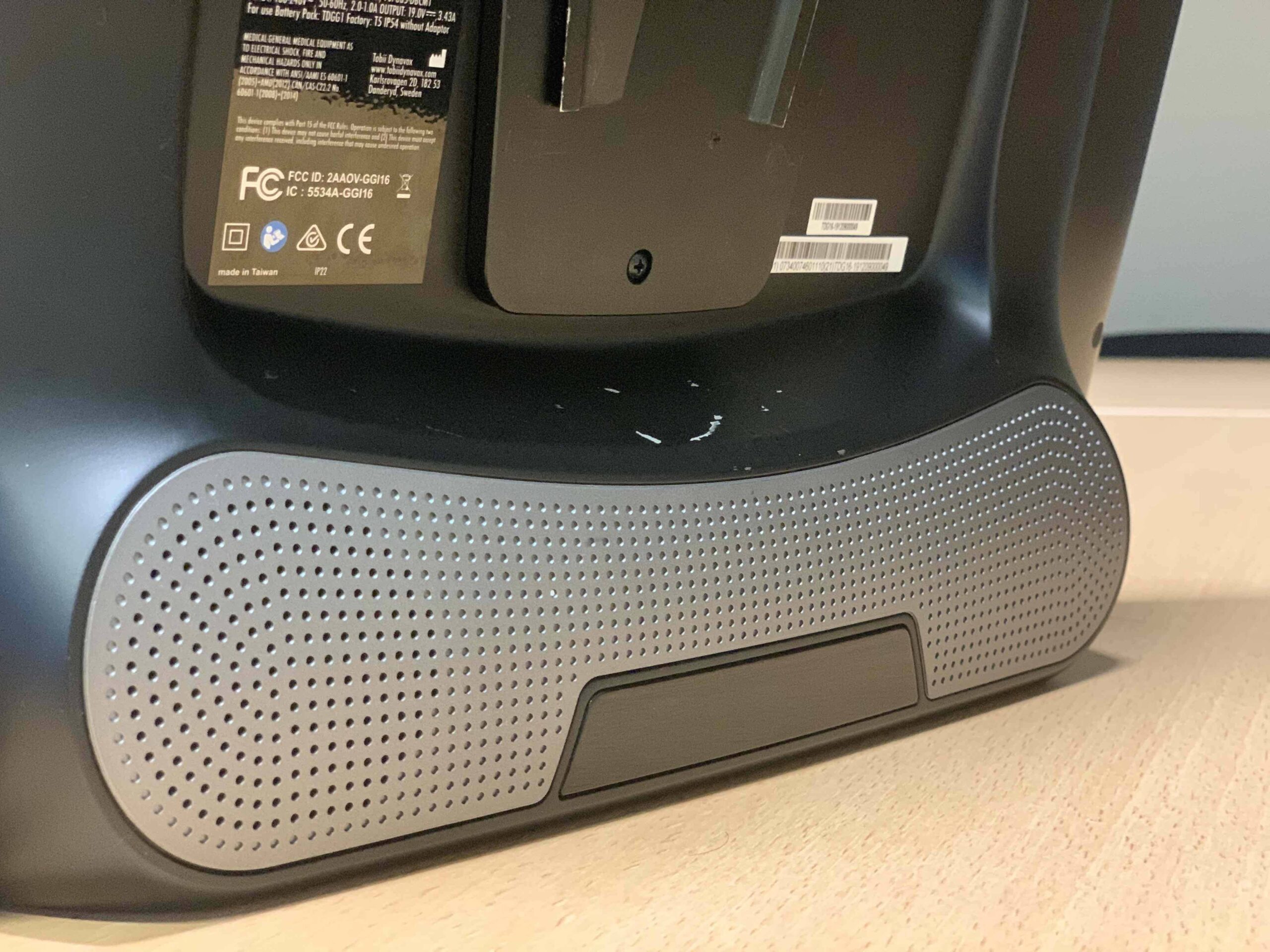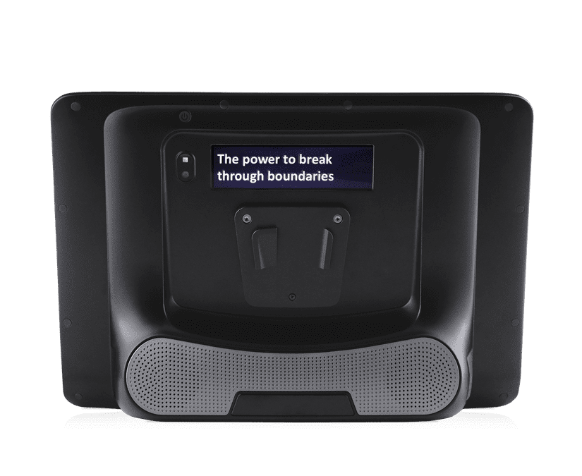 Sur la face avant, autour de l’écran tactile, on trouve une caméra frontale sur la partie supérieure, destinée aux photos, selfies, visioconférences… Sur le bas du système, la poursuite oculaire est encastrée dans l’appareil, les “boutons adaptatifs” utilisés et utilisables par le regard (les fonctions allouées à ces boutons diffèrent selon le logiciel actif), ainsi que les boutons de réglage du volume + et -.