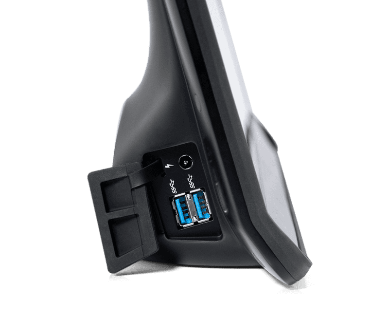 Les connectiques sont présentes sur les flancs latéraux et protégés d’une membrane caoutchouc évitant l’encrassement et l’humidité. A droite, 2 entrées contacteurs, 1 prise stéréo (jack) pour y brancher des écouteurs ou enceintes. A gauche, deux ports USB et la prise d’alimentation.