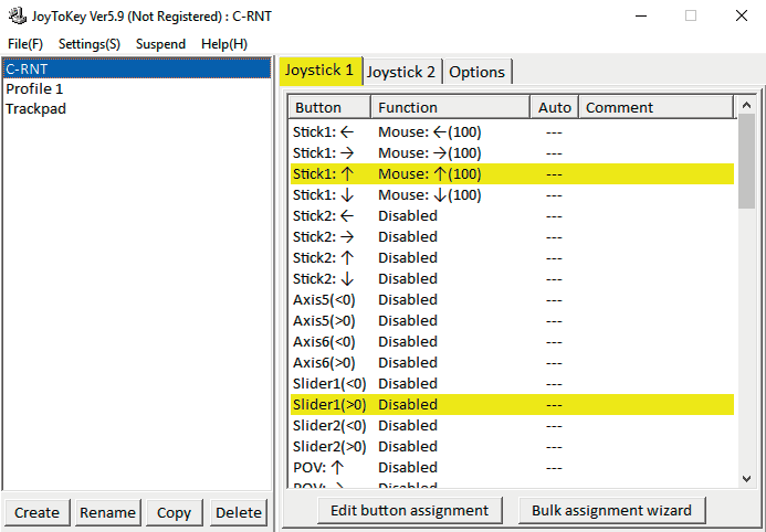 Dès que la manette est reconnue, les appuis sur le manche ou les boutons déclenchent une surbrillance en jaune des lignes correspondant à leurs fonctions, pour l’instant non programmées et marquées « Disabled ».