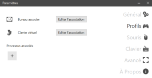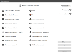 Lorsque vous accédez à “bureau associé” un mapping de la souris sur la manette est proposé par défaut. Si celui-ci vous convient partiellement, effectuez un clique gauche sur la touche que vous souhaitez modifier puis sélectionnez une option à lui attribuer dans le menu déroulant.