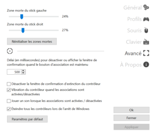 Notez que les options “mouvement de la souris” ainsi que “défilement de la souris” qui permettent le déplacement “libre” du curseur de la souris ne peuvent être mappés uniquement sur les joysticks de la manette. Pour les usagers ayants des difficultés de contrôles des joysticks ou d’amplitude musculaire par exemple, vous pouvez régler la sensibilité de ces derniers en augmentant ou en réduisant leur zone morte. Pour cela, rendez-vous dans le menu principal puis dans “avancé”. Vous pouvez également régler la sensibilité du curseur de la souris dans “souris”.