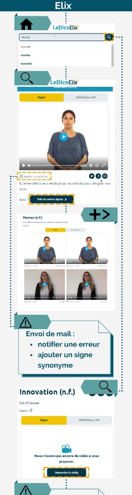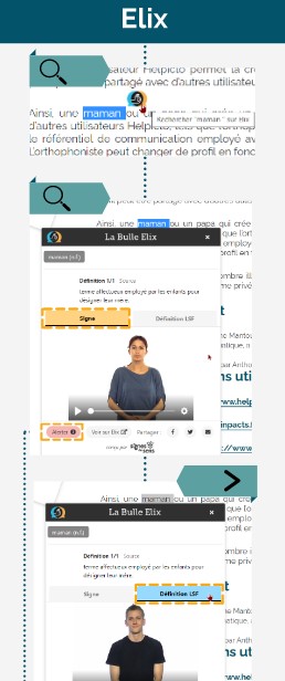 Depuis 2010, Elix – dictionnaire bilingue (Français – Langue des Signes Française) – se définit comme un outil contributif et participatif, en constant enrichissement, de par l’implication omniprésente de l’utilisateur au sein du système de création. Par ailleurs, cet outil est devenu depuis quelques années, une référence avec 37 500 vidéos de définitions et de signes à son actif.