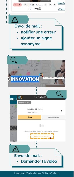 Vous retrouvez la même interface de vidéo avec le signe ou la définition. De plus, vous retrouverez les boutons pour alerter sur une erreur ou demander un signe. Cette extension est un outil développé dans le but de donner accès au contenu web pour tous.