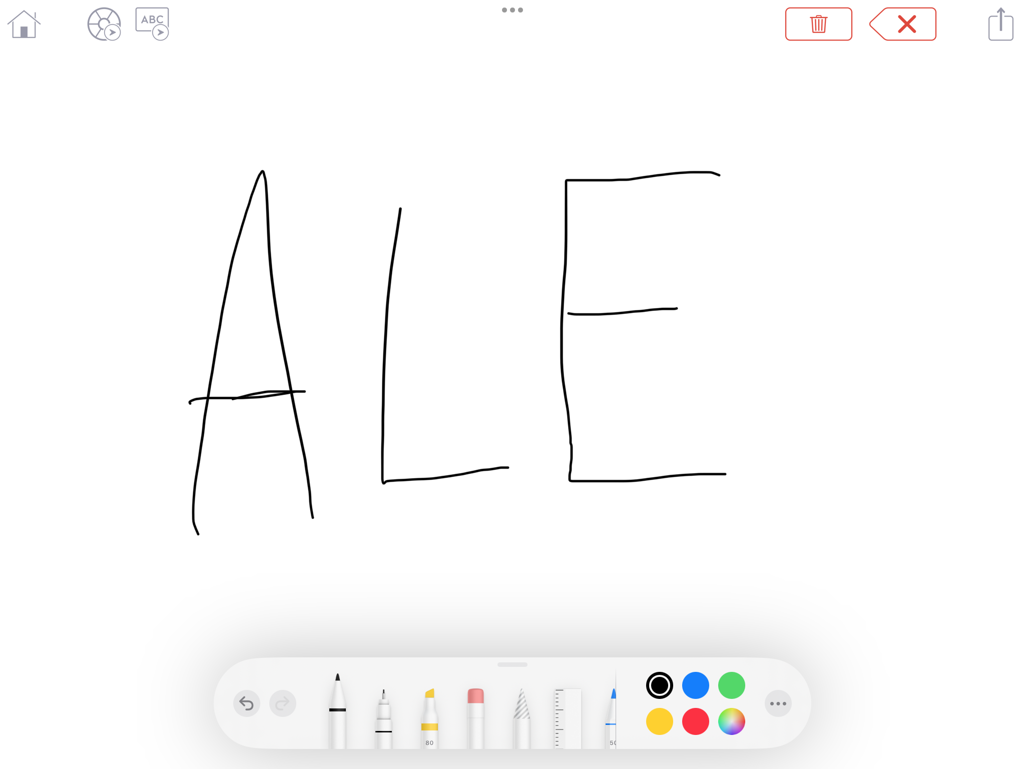 Parce que la multimodalité est fondamentale pour communiquer, l’application permet d’utiliser les pictogrammes, le langage écrit ou un tableau blanc. L’utilisation du tableau blanc permet d’écrire (même quelques lettres si le mot entier ne peut pas être écrit, l’interlocuteur devinera) ou de dessiner si le pictogramme souhaité n’est pas trouvé ou n’existe pas. On accède au tableau blanc directement depuis l’écran d’accueil du patient ou depuis l’écran de la grille des pictogrammes : flèche en haut à gauche > rectangle avec vagues en haut à droite.