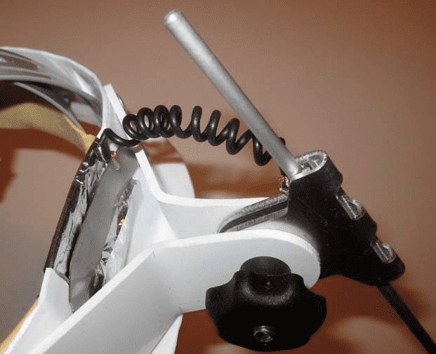 Le porte tige est composé de 3 pièces en PVC usinés à la fraiseuse numérique : deux bras support, rivetés à l’avant du casque et un serre tige.