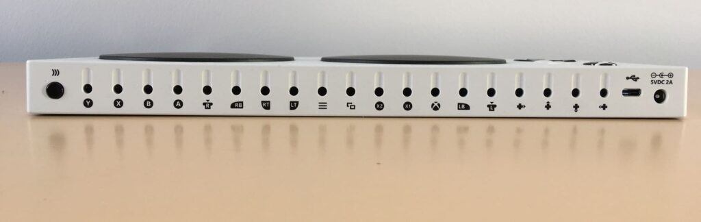 L’encombrement peut d’emblée étonner. La manette « classique » de la Xbox a complètement été déstructurée et les multiples boutons et leviers qui l composent se sont vus répartis dans un pupitre de près de 30 cm de long sur 13 cm de large pour une épaisseur variant de 2,2 à 1,8 cm. Cette légère déclivité permet de poser les mains sur le boîtier sans inconfort.