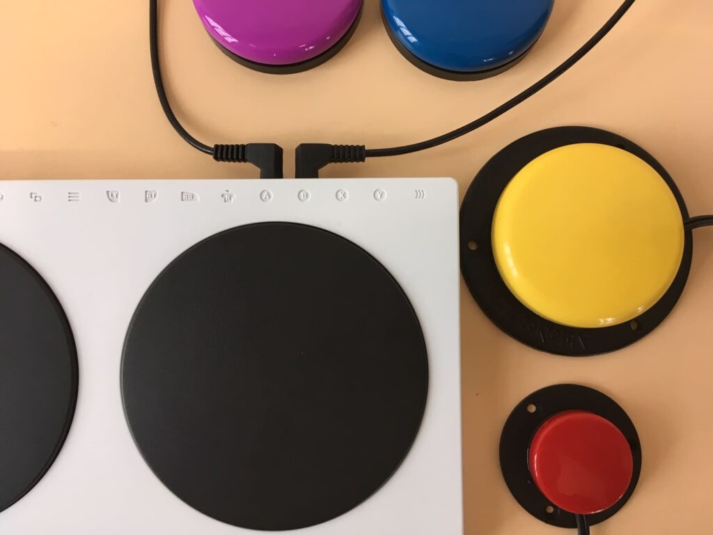 Nous avons testé des contacteurs de toutes tailles et sensibilités, tactiles ou au souffle. La manette adaptative offre la possibilité de connecter un grand nombre de contacteurs simultanément : cela permet de tester une grande variété de configurations et de positionnements possibles en une seule fois.