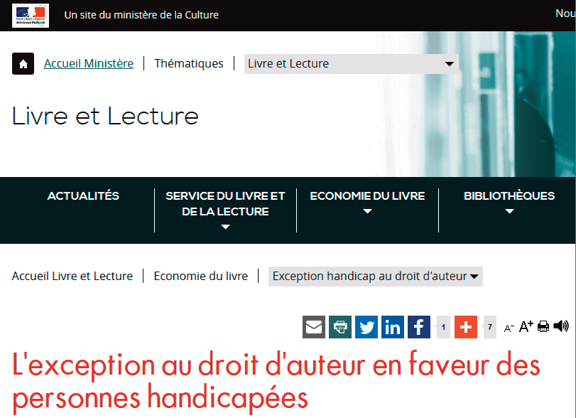 En savoir plus www.culture.gouv.fr/Thematiques/Livre-et-Lecture/Economie-du-livre/Exceptionhandicap-au-droit-d-auteur