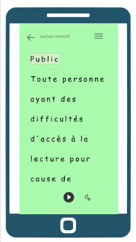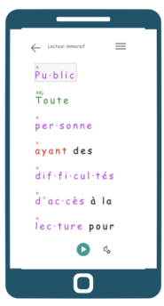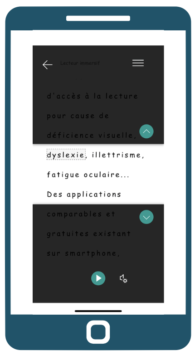 On peut modifier, l’apparence du texte (taille du texte, espacement entre les lignes, police, contraste visuel), afficher la séparation des syllabes et/ou un code couleur selon la nature des mots. Il est possible d’apposer une bande lumineuse permettant de se concentrer sur 1,3 ou 5 lignes (comme une règle de lecture). De plus, une illustration pictographique des mots apporte un soutien à la compréhension, et une synthèse vocale permet de lire mot à mot intégralement le texte.