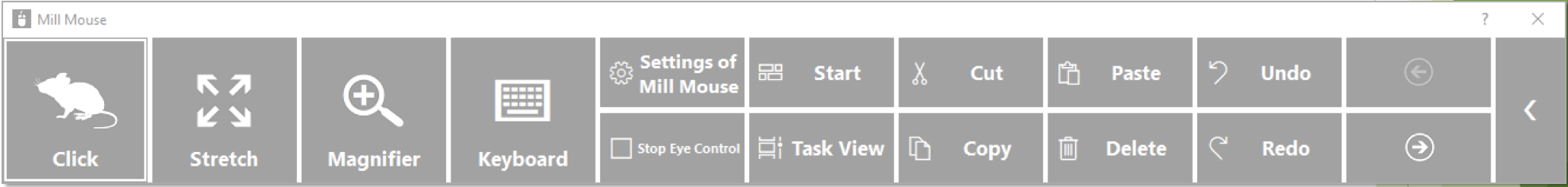 Mill Mouse se présente comme une barre d’outils accessible directement sur le bureau. Par défaut, elle présente une série d’options dont les différents clic de la souris le clavier, la loupe, les réglages, la mise en pause du contrôle oculaire, et les fonctions standard de Windows.