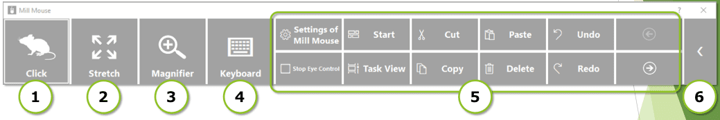 Connectez Tobii Eye Tracker 4C à votre PC. Dans le menu Démarrer, cliquez sur Mill Mouse. La fenêtre Mill Mouse s’affiche en haut à gauche de l’écran du bureau. Et les fonctions basiques apparaissent. Par défaut, la validation s’active avec un auto clic (en maintenant le regard sur la zone à valider) . La fenêtre de Mill Mouse se présente en deux parties :