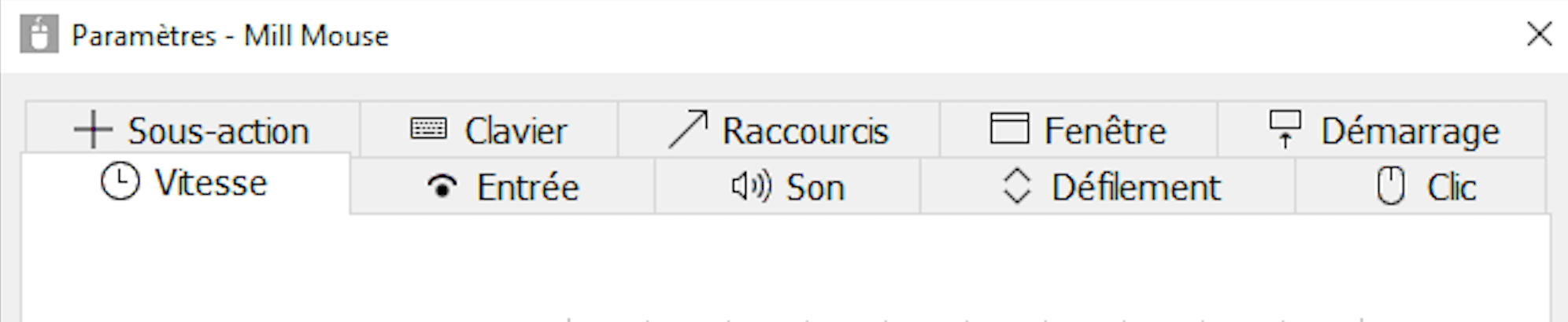 vous pourrez ici configurer l’apparence de la fenêtre et son positionnement. Vous pouvez choisir de conserver la fenêtre principale au premier plan ; au contraire, de masquer automatiquement la fenêtre de Mill Mouse lors de l’usage d’autres outils, de rendre la fenêtre transparente lorsqu’elle est inactive. Il est également possible de modifier la couleur et la visibilité de la fenêtre Mill Mouse. Elle peut ainsi apparaître en gris, ou en noir, le bouton “automatique” active un contraste de bleu sur blanc dans la fenêtre ; ses fonctions sont compatibles avec les options d’accessibilité de Windows ; c’est-à-dire que si vous avez choisi un contraste spécifique il s’adaptera sur la fenêtre Mill Mouse.