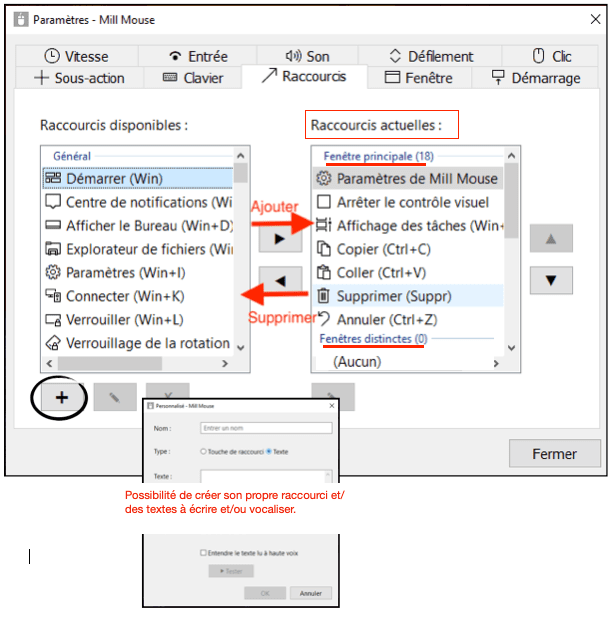 l’ajout de bouton spécifique. En appuyant sur le bouton “+” , une fenêtre de dialogue va s’ouvrir vous permettant d’ajouter un bouton. Vous allez pouvoir nommer ce bouton choisir le type un raccourci clavier ou du texte. Ainsi vous pouvez définir un bouton avec une action spécifique (un raccourci clavier personnalisé) ou du texte qui pourra être écrit et/ou vocalisé. Cette fonctionnalité nous semble particulièrement utile dans un contexte de présentation, ou de préparation d’une rencontre ou d’une événement de communication. Enfin, il est possible de créer plusieurs fenêtres pour Mill Mouse. La fenêtre principale affiche les fonctions à prioriser, les fenêtres secondaires s’affichent indépendamment.