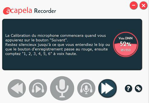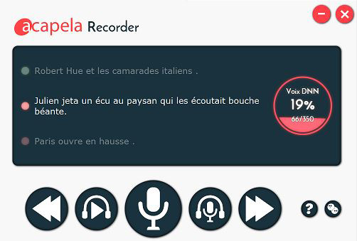 Le service ne demande aucune compétence ni équipement particulier, si ce n’est un ordinateur, un micro-casque et une connexion. Préalablement, il faut solliciter la création d’un compte à l’adresse : mov.acapela-group.com/start-now. Après connexion grâce au login communiqué, vous serez invité à télécharger le logiciel « Acapela Recorder », disponible en version Mac et Windows. Au lancement, le logiciel vous invitera à choisir la langue, puis de choisir et configurer le microphone : un micro-casque ou microphone sur pied (USB). L’utilisation d’un microphone interne est déconseillée.