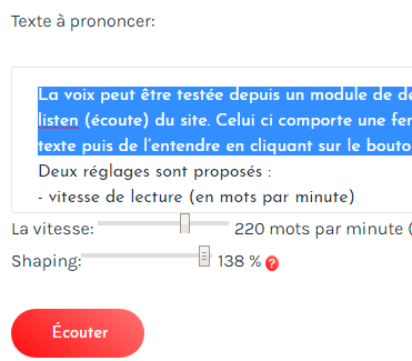 La voix peut être testée depuis un module de démonstration accessible depuis l’onglet listen (écoute) du site. Celui ci comporte une fenêtre permettant de saisir ou copier un texte puis de l’entendre en cliquant sur le bouton de lecture. Deux réglages sont proposés :