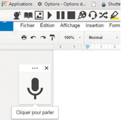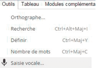 Dans Google Docs, ouvrir un nouveau document, cliquer sur le bouton “outils”, puis sur “saisie vocale”.