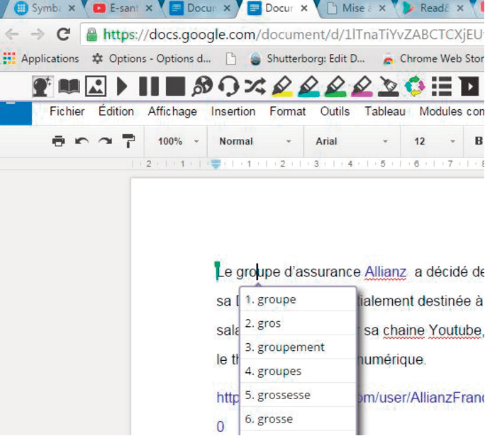 Utilisable sous Google Chrome mais optimisé pour Google Docs, Read&Write se présente sous la forme d’une barre d’outils permettant la lecture par voix de synthèse, la dictée vocale, l’écriture assistée d’un mode prédictif, l’accès à des dictionnaires, la surbrillance du texte, etc.