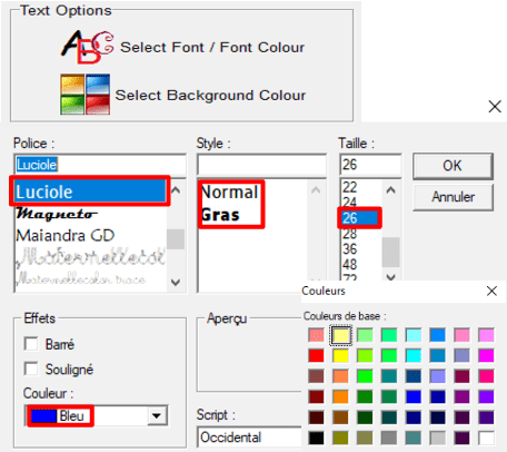 Choix de la police (couleur, taille, style et taille) et de la couleur de fond