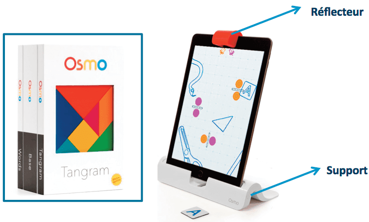 Les applications OSMO nécessitent des accessoires : un kit de positionnement de l’iPad qu’on place sur son support et un réflecteur au-dessus de la caméra. La caméra est alors capable de voir et les applications d’analyser ce qui se passe devant l’iPad. La technologie est tout à fait novatrice en utilisant l’intelligence artificielle sollicitée par le réflecteur vers la caméra.