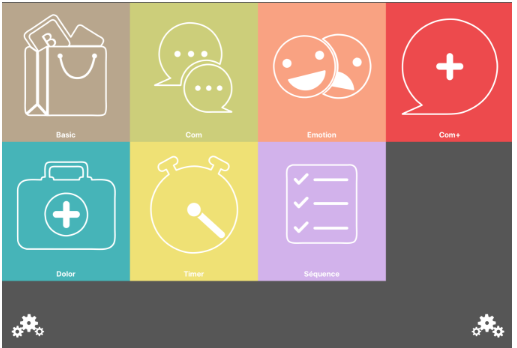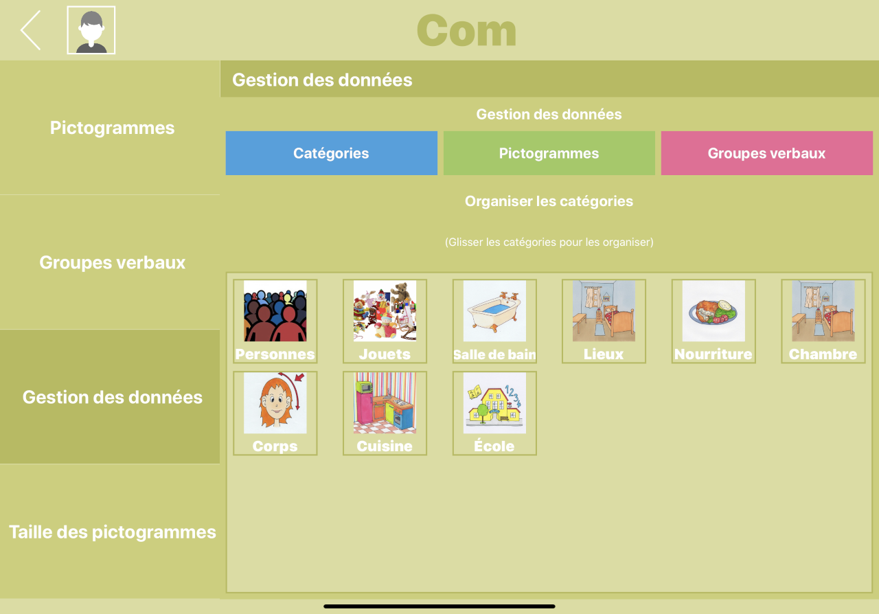 Le module Com est conçu pour l’expression et la mémorisation des mots et phrases du quotidien. En haut, une barre de pictogrammes de catégories (glissable). Le picto sélectionné s’affiche au centre de l’écran, en grand format, pendant que le message est émis. Cette animation est réglable. Si on choisit une catégorie pour laquelle des groupes verbaux ont été associés alors ils s’afficheront sur la gauche dans une barre verticale et on pourra associer un groupe verbal et un pictogramme.