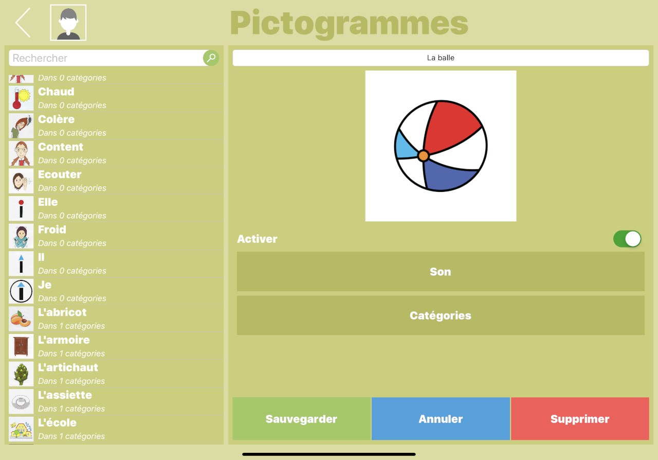 Chaque nouveau picto sera placé dans la bibliothèque (par ordre alphabétique ou ordre d’utilisation).