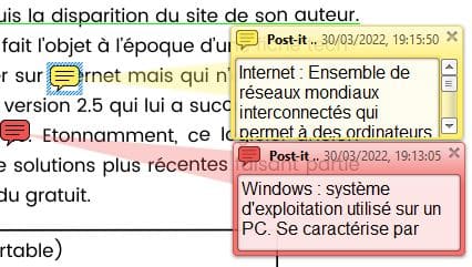 Cette fonction permet d’afficher un commentaire en retrait du texte. Quand la note est fermée, un double clic sur son icône la ré-ouvre. Un clic droit sur l’icône permet de choisir la couleur de la note.