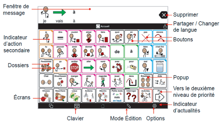 Les boutons de pictos forment les messages qui s’affichent dans la fenêtre. Un clic dedans et le message complet est émis, automatiquement effacé par défaut une fois oralisé. Suppression possible.