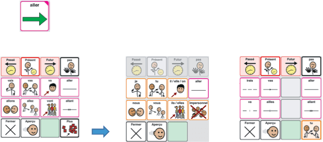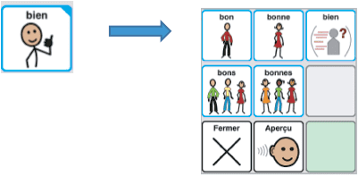 Dans ce mode, on personnalise le vocabulaire avec beaucoup de pictos tout prêts : supprimer, coller copier, déplacer sur un autre niveau, trier, échanger ou exporter un picto. On peut aussi changer les couleurs de fond, de bordure, la largeur de bordure, l’affichage de texte ou pas, estomper ou masquer le picto.