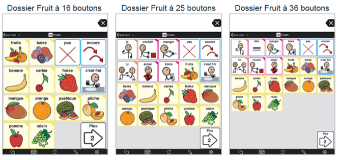Le vocabulaire Crescendo™ intégré à Proloquo2Go contient un vocabulaire de base fréquent et utile, déjà programmé sur 23 (!!) tailles de grille et 3 niveaux de compétences langagières (cf. fiche précédente pour généralités sur vocabulaire de base).