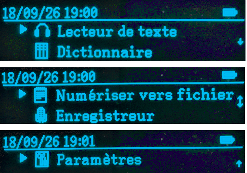 - Quand le stylo est levé, les mots scannés sont reconnus, affichés à l’écran et prononcés par la voix de synthèse féminine. Nouveauté : un appui prolongé sur le bouton « OK » affiche en plein écran le mot surligné et le prononce à nouveau. Pour un complément d’information concernant la technique de capture, les performances et exceptions, revoir les conditions d’utilisation et test de notre précédente fiche technique N° 59 rubrique 12 ou saisir « ExamReader » sur la base de données de notre site..