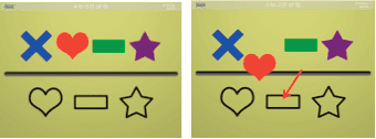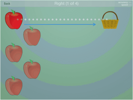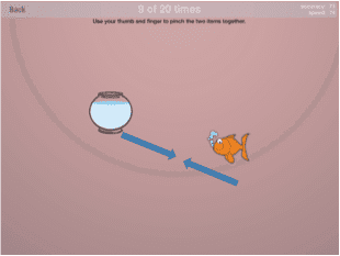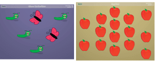 Toucher : il s’agit de toucher de 2 à 20 objets répartis sur l’écran. A chaque appui, un changement d’images et un tintement accompagnent le geste. Les objets changent à chaque exercice.