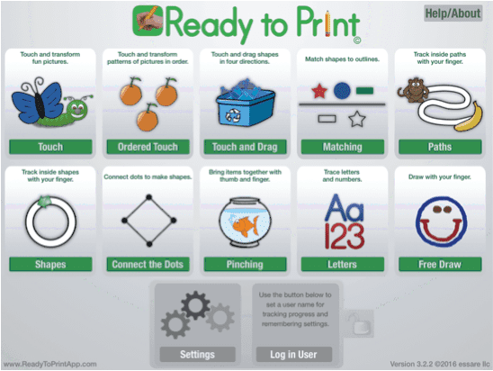 Ready to Print offre une progression depuis les gestes du pré graphisme, avec une attention sur la coordination visuo motrice, visuo perceptive, vers les gestes plus complexes et les praxies nécessaires à une écriture correcte ainsi qu’à un maniement de la tablette tactile.