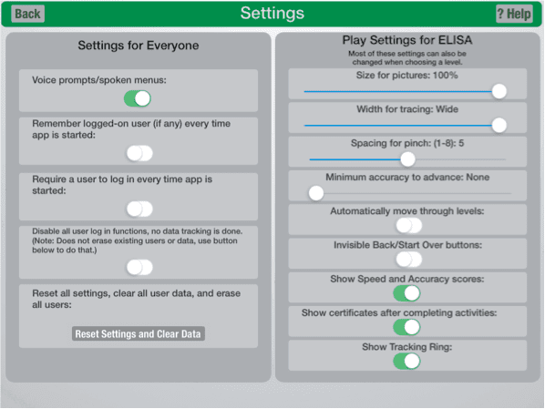 Le bouton Settings (paramètres) permet de sélectionner le niveau par défaut d’utilisation de l’application, ainsi que les réglages spécifiques de chaque élève (une aide en anglais peut être nécessaire pour lire les indications). Dans ce bouton Settings, le bouton View Progress (évolution) permet de visualiser les séances précédentes quand la réussite n’a pas été atteinte encore.