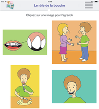 Dans chaque rubrique : rôle de la bouche, visite chez le dentiste, brossage, les instruments, la radio, le méopa, on trouve les pictogrammes déjà développés pour les fiches papier complétés par d’autres. On peut les agrandir et écouter un message explicatif.