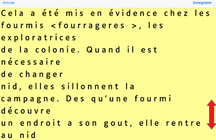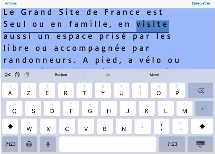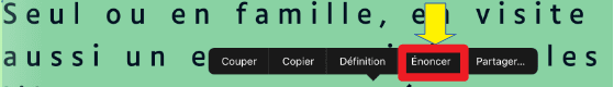 Le texte affiché au sein de l’éditeur peut être lu par voix de synthèse. Une option permise par le système d’exploitation IOS en sélectionnant le texte, puis en choisissant l’option « Enoncer ». Rappel : Menu Accessibilité > Contenu énoncé > activer : « Enoncer la sélection ».