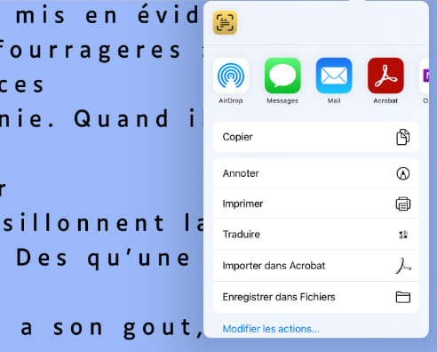 La photo s’affiche dans une interface permettant de capturer sélectivement la zone de texte en déplaçant les poignées situées aux quatre coins de l’image. L’application propose ensuite de conserver le scan, ou de reprendre le cliché. L’OCR sera appliqué sur les zones de texte : les images ne seront pas conservées.
