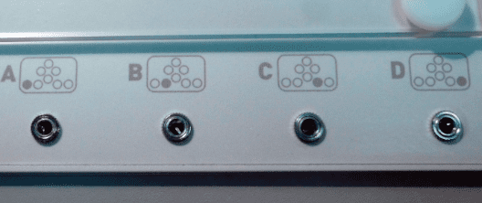 En face arrière, quatre connecteurs permettent le branchement de contacteurs externes correspondant aux quatre boutons du bas (fonction clic).