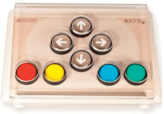 Conçu par BJ Adaptaciones (Espagne), B Joy Joystick button est un boîtier qui présente en façade 8 gros boutons, dont 4 disposés en croix, pour faciliter l’accès aux fonctions déplacements et clic de la souris aux jeunes enfants ou personnes souffrant de tremblements.