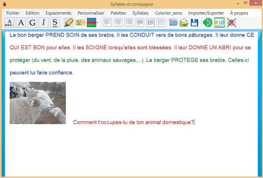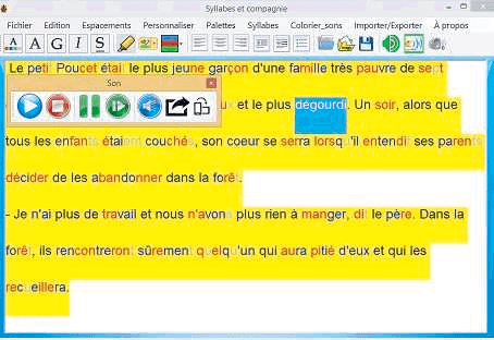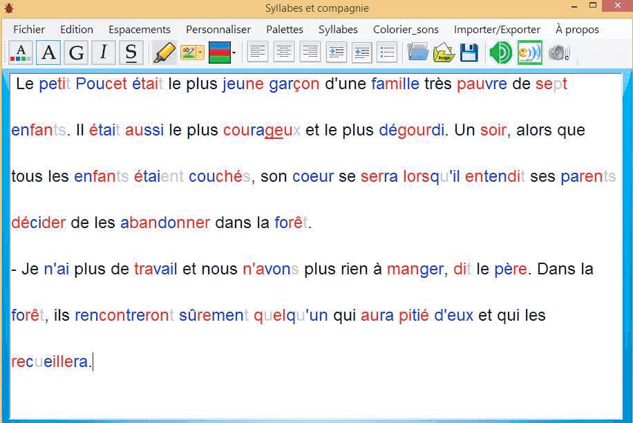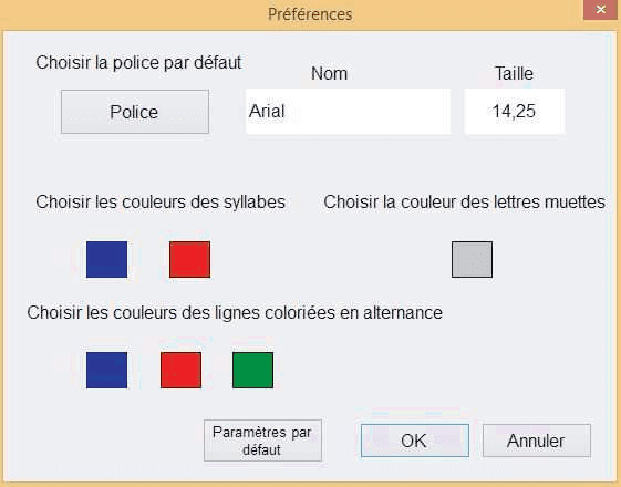 Un clic sur le bouton “Syllabes” déclenche la colorisation alternée des syllabes et la colorisation des lettres muettes. Le choix des couleurs s’opère depuis le menu “Personnaliser, puis Préférences”.