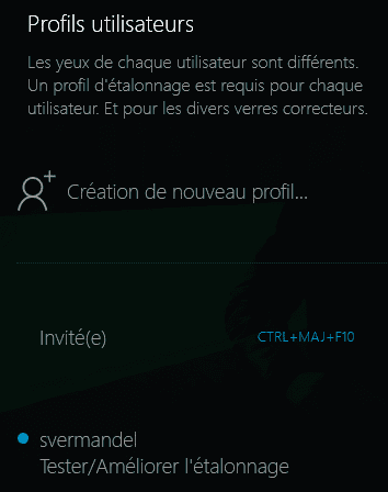 Toutefois, pour améliorer la précision, vous pouvez vous assurer que les deux yeux sont centrés sur l’icône Tobii dans la barre des tâches dans le bas de l’écran. En cliquant sur cette icône, vous ouvrez la fenêtre de paramétrage de Tobii et en cliquant sur la partie basse qui affiche la détection de vos yeux, vous accédez à un écran qui vous permet de créer un nouveau profil, de tester ou d’améliorer le profil actuel. En choisissant d’améliorer votre profil, vous allez ajouter des points de calibration. Notez que vous pouvez dans la fenêtre de test, optez pour ne commander qu’avec un seul oeil ou les deux, ce qui peut parfois être utile.