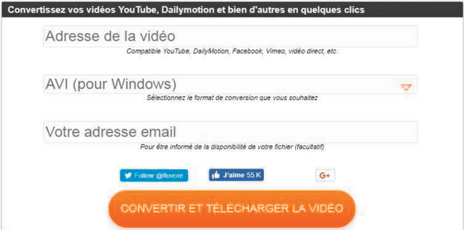 Depuis ce site de service en ligne, il suffit d’entrer l’adresse URL de la vidéo, choisir le format de téléchargement (nous conseillons le format AVI pour Vidéo Clic), il n’est pas nécessaire de mentionner une adresse mail, puis cliquer sur convertir le fichier.